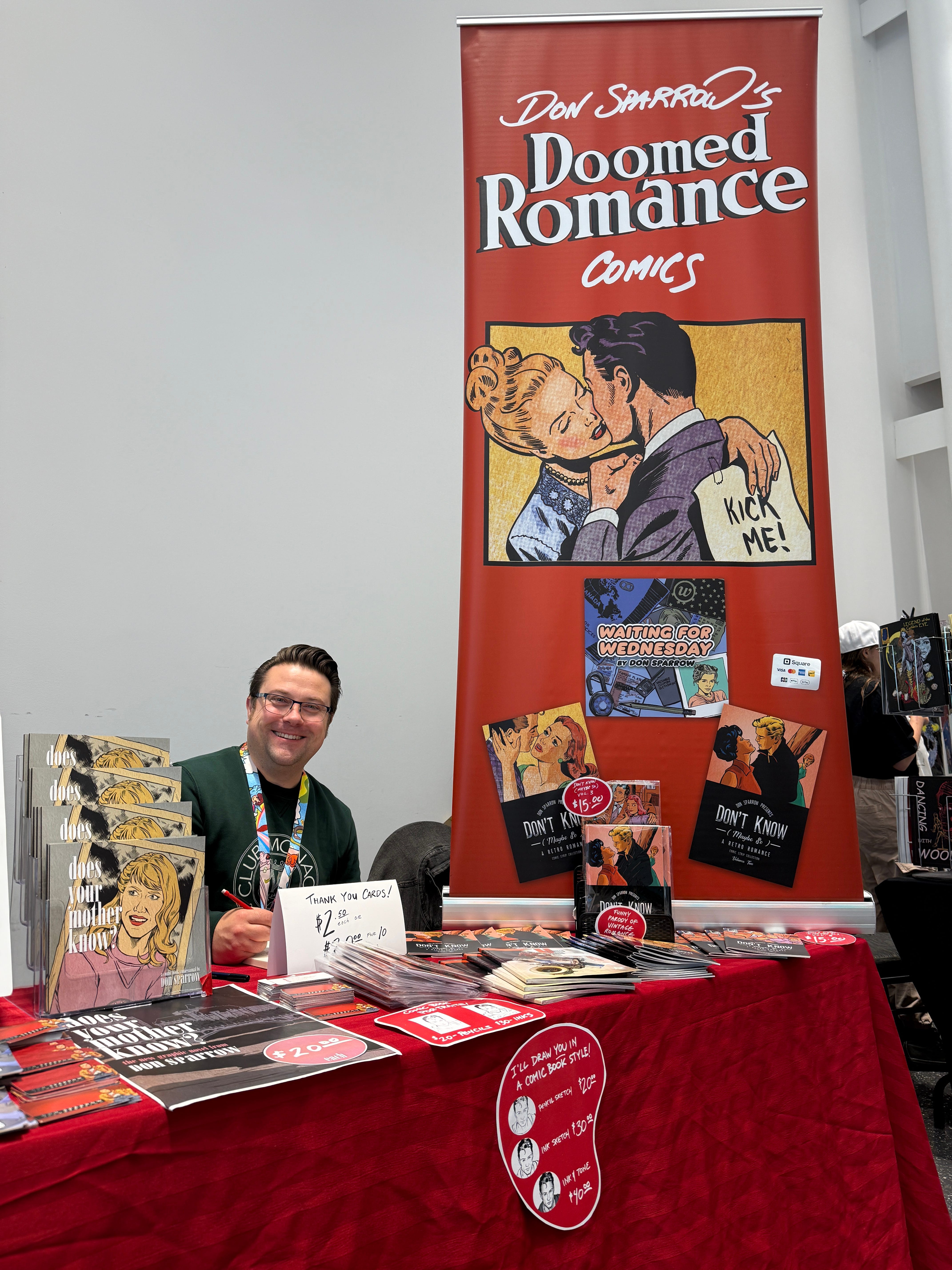 I was touched that my sister-in-law (and fellow Godspell alum) Sheryl popped by (and brought the heavy boxes of books I’d shipped to her and Zach—saving me from crippling airline freight fees). And I was thrilled to see my old Winnipeg C4 comic con buddy Alyssa Fraser, now a wildly successful tattoo artist, who came by with her fella to say hello and grab my newest book.